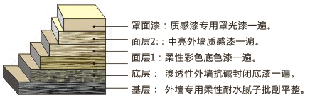 中亮質(zhì)感涂料由精細分級的填料,純丙烯酸粘結(jié)其它助劑組成。特別設(shè)計的粘度結(jié)構(gòu),柔韌性佳、抗碰撞及沖擊,涂層具優(yōu)異的耐候性,憎水透氣性,能有效橋連和掩蓋墻體的細小裂縫。本品中含粒徑較大的石英砂粒,施工時使用泥刀平批,用蘸水的清潔小木板刮砂,可橫刮、豎刮或弧形刮,紋理具阿爾卑斯山刮痕效果,豪邁奔放。(建議涂刷一至兩層防塵面涂以提高防塵耐污性。)